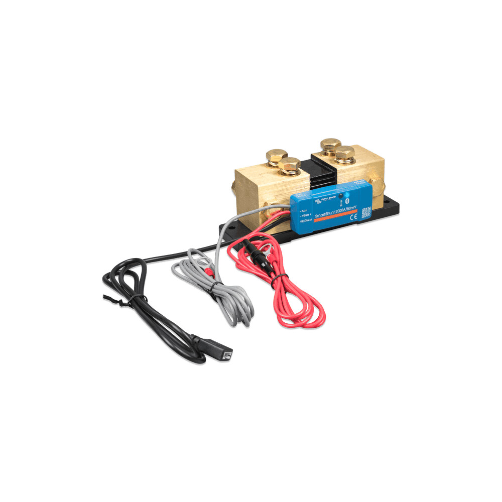 Victron IP65 2000A / 50mV SmartShunt - Bluetooth Enabled Every System using batteries should always have a SmartShunt Fitted, these are very Quick and Simple to install and give you real-time battery information and load usage information. once fitted the SmartShunt takes away the guess work from looking at battery state of charge by voltage, and gives you an easy to understand and accurate State of Charge by Percentage (%) and time remaining. IP65 Water Proof - ideal for Boats Alternative to BMV-712 Battery Monitor Smart Enabled Bluetooth for VictronConnect App GX Device Connectivity via VE Direct Port Smart Battery Shunt IP65 Water Proof Rating The SmartShunt is an all in one battery monitor, only without a display. Your phone acts as the display. The SmartShunt connects via Bluetooth to the VictronConnect app on your phone (or tablet) and you can conveniently read out all monitored battery parameters, like state of charge, time to go, historical information and much more. Ideal for Monitoring batteries on your boat, or in damp conditions thanks to the IP65 rating Alternatively the SmartShunt can be connected and be read by a GX device. Connection to the SmartShunt is made via a VE.Direct cable. The SmartShunt is a good alternative for a BMV battery monitor, especially for systems where battery monitoring is needed but less wiring and clutter is wanted.The SmartShunt is equipped with Bluetooth, a VE.Direct port and a connection that can be used for: monitoring a second battery, midpoint monitoring or a temperature sensor.
