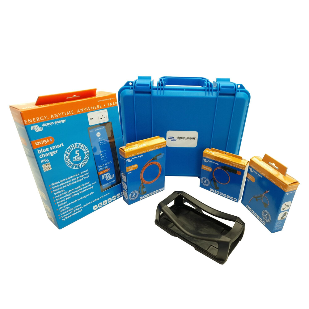 Victron BluePower IP65 12v 15amp 230v (UK) Charger with Case and Accessories A great Charging system that includes many optional accessories all housed in a neat and heavy duty Victron Carry Case The Blue Smart IP65 Charger is the new professional battery charger with built-in Bluetooth. The Blue Smart IP65 Charger can be used on devices in your workshop and on motor vehicles, such as (classic) cars; motorbikes; boats and camper-vans. The battery is charged, smartly... to perfect condition Recovery of deeply-discharged 'dead' batteries Connect the battery with ease Check the status of your battery remotely with built in Bluetooth Accessories Included in This Kit Battery Indicator M8 Eyelet with 30amp Fuse 2 Meter Extension Cable 12v Cigarette Plug with 16amp Fuse Rubber Bumper for IP65 Charger Blue Power Heavy Duty Carry Case