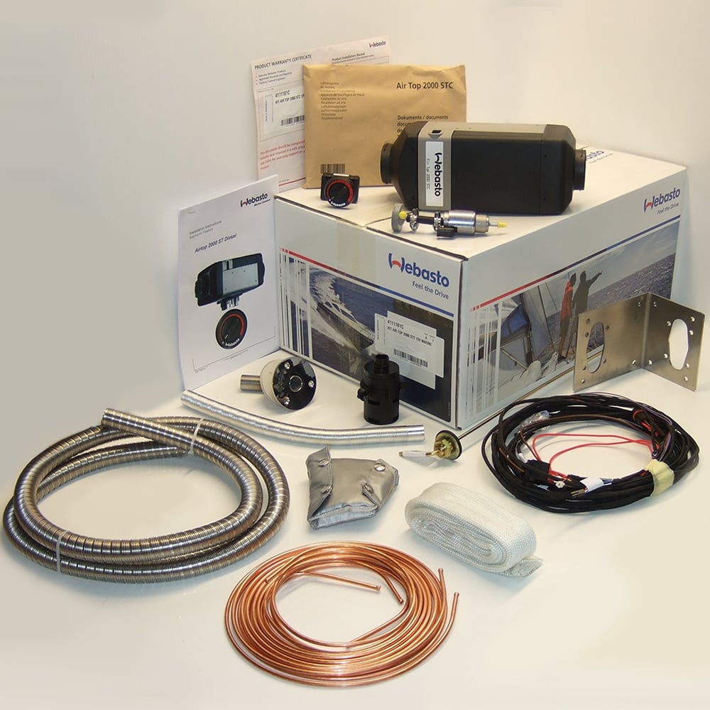 12v Webasto Air Top STC Marine Diesel Heater Kit This Webasto Air Top 2000 STC marine heater kit comes with a complete installation kit for your boat. This heater kit can be viewed as a starter kit, supplied with standard rheostat electronic temperature control. Upgrades to the Smart Controller or 7 Day Timer* are available. The compact Webasto Air Top 2000 STC offers optimised fuel efficiency (less than 1lt diesel per hour maximum) to provide whisper quiet heating. Programmable engine independent heating (does not use heat from the engine) for many types of marine use. Certified for installation in passenger areas and in proximity to dangerous substances. Webasto basic marine kits do not include warm air outlets & ducting, please check out our range of additional ducting, warm air outlets and digital controllers to enable a truly bespoke and cost-effective Marine heating solution. If you are usure of your requirements contact the Butler Technik support team. We also recommend that you consult with a marine engineer or similar qualified professional. Webasto Marine heater 12 volt 2.2kw kit contents: Webasto Air Top 2000STC self regulating 12 volt air heater Modulator with temperature regulation with On-board diagnostics (Upgrade to 7 day timer Optional) All electrical harnesses and connections 1.5 metres of insulated/lagged stainless steel exhaust pipe (Additional lengths of 24mm Exhaust pipe available if required 1 x Exhaust heater outlet adapter, 22-24mm id converter Copper Fuel pipe system, complete with fuel metering pump 1 x Fuel Stand Pipe All necessary clips and screws for this installation included Comprehensive installation manual Stainless steel Heater mount bracket Stainless steel exhaust hull skin fitting External air temperature sensor Webasto UK Air Top 2000ST 24 month warranty Upgrades and Options Add warm air outlets with our additional one outlet ducting kit 60 mm warm air ducting is available in custom lengths 24mm stainless steel exhaust cut to length (part number 24MMEXH) and 40mm exhaust lagging Mounting close to living/sleeping berths? - Marine specific exhaust silencer available This is a genuine Webasto heater with a UK 24 month Global Warranty Custom Marine Heater Kits Butler Technik stock an extensive range of marine heater parts and can create a bespoke marine kit suitable for your requirements. Please contact our experienced sales team for advice and guidance.